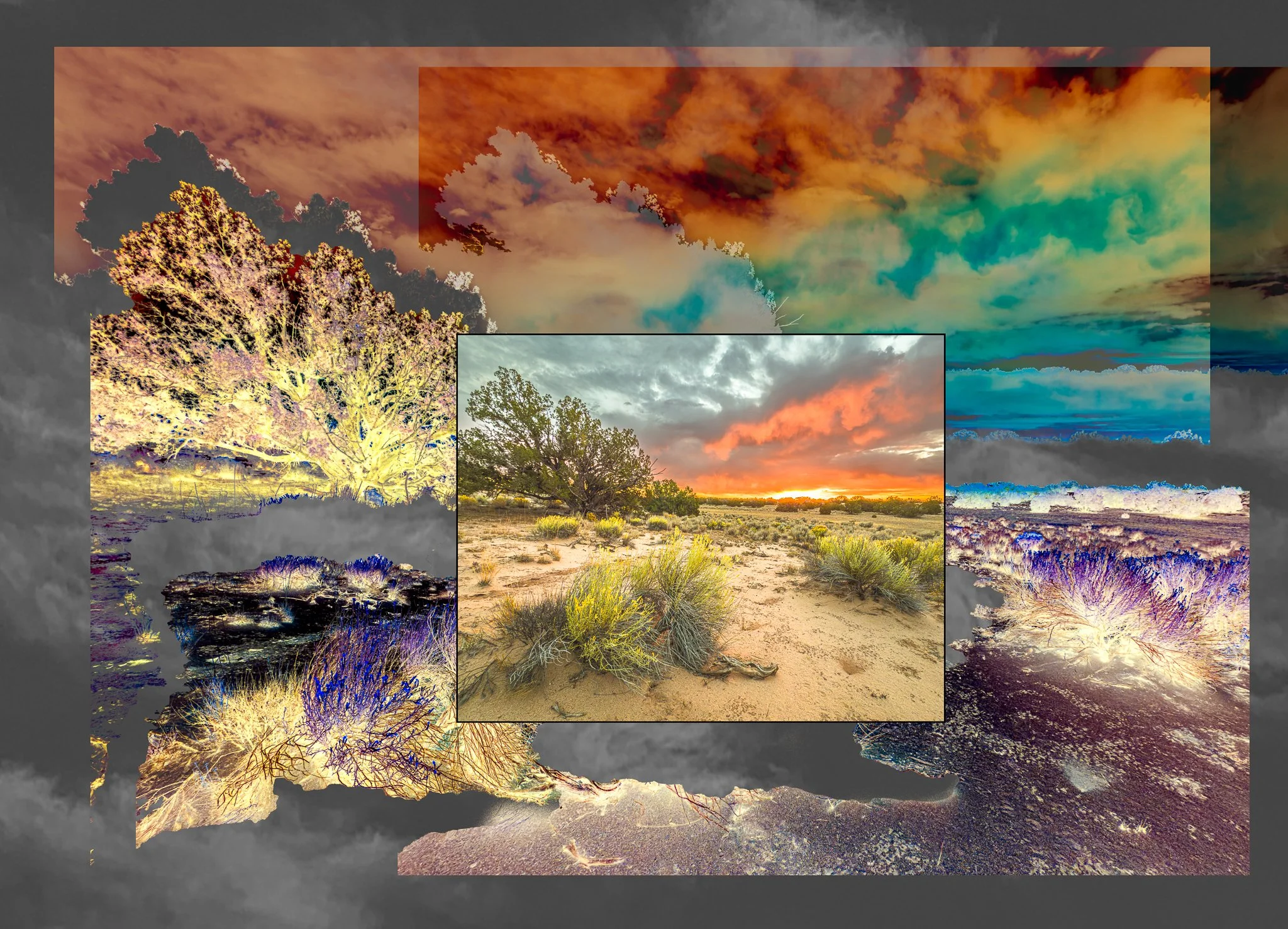 Dans ce nouveau travail, je cherche plutôt à évoquer l’instabilité et le sentiment de passage vers un monde inconnu, étranger, et peut-être de plus en plus précaire. Mon intention est de juxtaposer des paysages traditionnels familiers avec des éléments qui communiquent l’incertitude. Chaque image fusionne deux versions du même sujet : l’une rendue comme paysage classique, l’autre une version déformée obtenue par inversion des couleurs. La tension entre la représentation claire et la distorsion abstraite parle d’un monde au bord du gouffre — pas encore irrémédiablement perdu, mais fragile et en mutation.